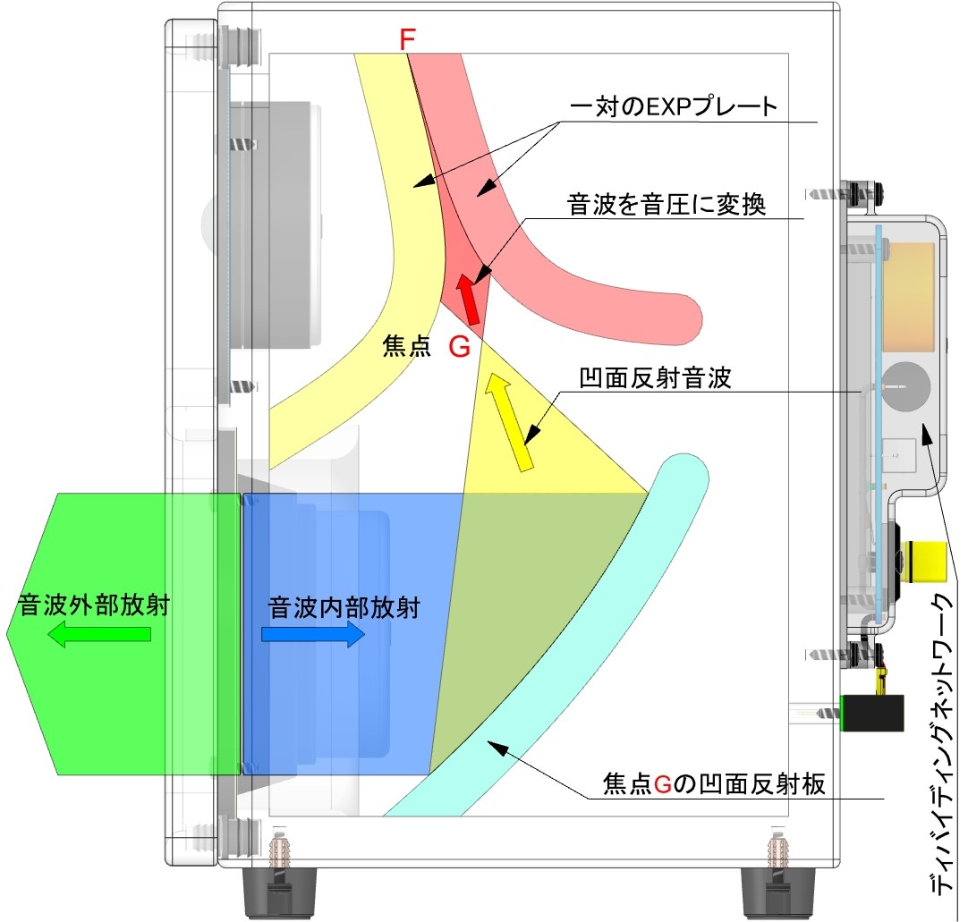 音波外部放射(➜)と同時にボックス内部に同量の音波内部放射(➜)が行われます。内部放射音波は焦点(G)の凹面板で反射し凹面反射波(➜)となり、焦点(G)に集音されます。その後一対のエクスポネンシャルカーブ形状(黄色とピンク色)の対向内壁面に沿って(F)方向に移動すると凹面反射音波は(F)に近づくにつれて音圧に変化し音波は消滅します。音波外部放射波はスピーカーボックス内部から何の干渉も受けないので、歪が少なく透明で高音質な音波を再生できるのです。
