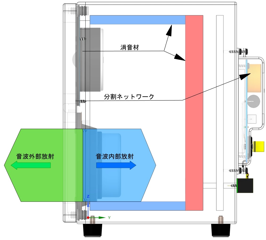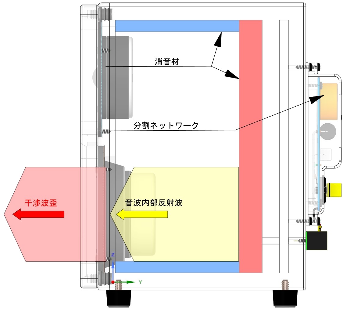 音波外部放射(➜)と同時にボックス内部に同量の音波内部放射(➜)が放射されます。内部放射された音波はスピーカーボックス背面に衝突します。 背面には音波消音材(■)が取付られ、音波を消音しようとしますが、特に低音帯域の音波を消音しきれず音波内部反射波(➜)としてスピーカードライバーのコーン紙に衝突し、音波外部放射(➜)と干渉します。これが「歪」となるのです。