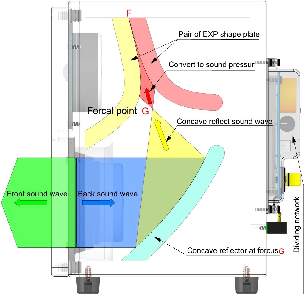 Sound waves emitted internally from the woofer are reflected by the “concave reflector” (green) and focused on the center of the aperture. They are focused to the center (G) of the aperture of a pair of exponential curves (yellow and vermilion). As the sound wave travels from the focal point (G) to the exponential curve (F), the sound wave is converted to sound pressure. This conversion causes the sound waves to dissipate. Since the speaker driver is not subject to reflected sound waves from inside the speaker box, the woofer has extremely low distortion and high sound quality.