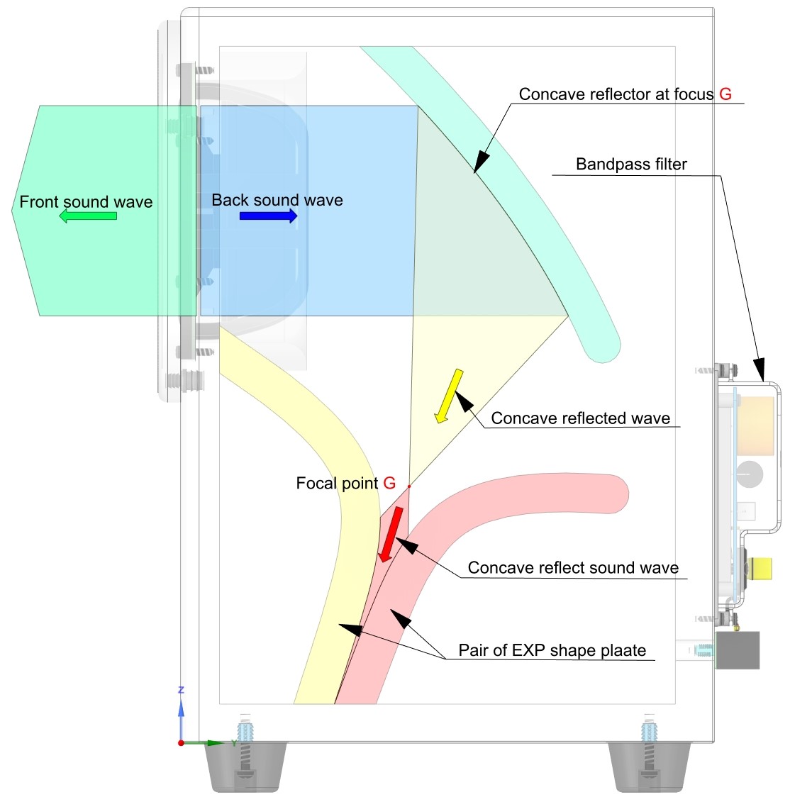 Sound waves emitted internally from the bottom-mounted mid-woofer are reflected by the “concave reflector (green)” and focused at the center of a pair of exponential reflectors (G). They are focused at the center of a pair of exponential curve apertures (yellow and vermilion). As the sound waves travel from the focal point (G) to the exponential curve (F), they are converted to sound pressure. This conversion causes the sound waves to dissipate. Speaker drivers do not receive reflected sound waves from inside the speaker box, resulting in extremely low distortion and high sound quality.
