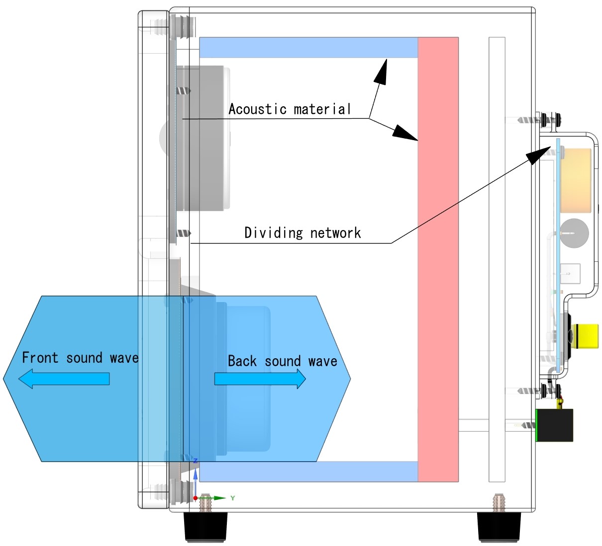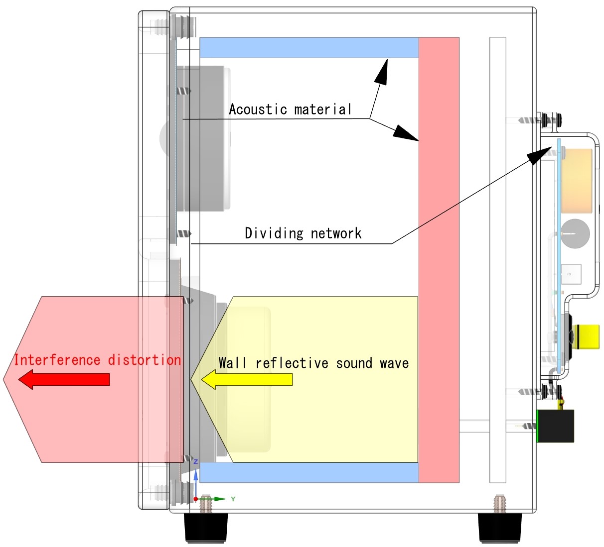 The figure below shows a horizontal perspective view of the conventional speaker. At the same time as the external radiation of Front sound waves (➜), the same amount of internal radiation of Back sound waves (➜) is emitted inside the box. The internally radiated sound waves collide with the back of the speaker box. A sound wave muffler (■) is installed on the back of the box to muffle the sound waves, but it cannot fully muffle the Back sound waves, especially those in the bass band, and they hit the cone paper of the speaker driver as internal reflection waves (➜), interfering with the external radiation (➜). This is what we call “distortion.