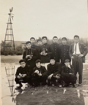 私の高校は青森県の日本海に面した丘(高さ40m)の上にありました。眼下には漁港があり、2つの防波堤の頂上には2つの灯台(赤と青、高さ約7メートル)がありました。 このような環境で、私は流体力学に興味を持ち、風力発電機を作りました。電信柱4本(高さ14m)で作り、上部に直径5メートル、5枚羽根の風力発電機を作りました。下の作業室には車のバッテリーを10個置いて風力発電機から発生する交流を直流に変換し、バッテリーに常時充電する装置を作りました。夜間は風力発電機の上部から日本海に向けて青色のライトを点灯させました。夜間に操業する漁船からは、かなり離れていても点滅灯がよく見えるので、港の位置がよくわかると好評でした。